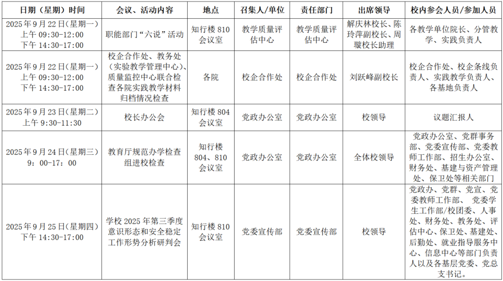 2025年秋季学期第四周全校性会议活动安排表