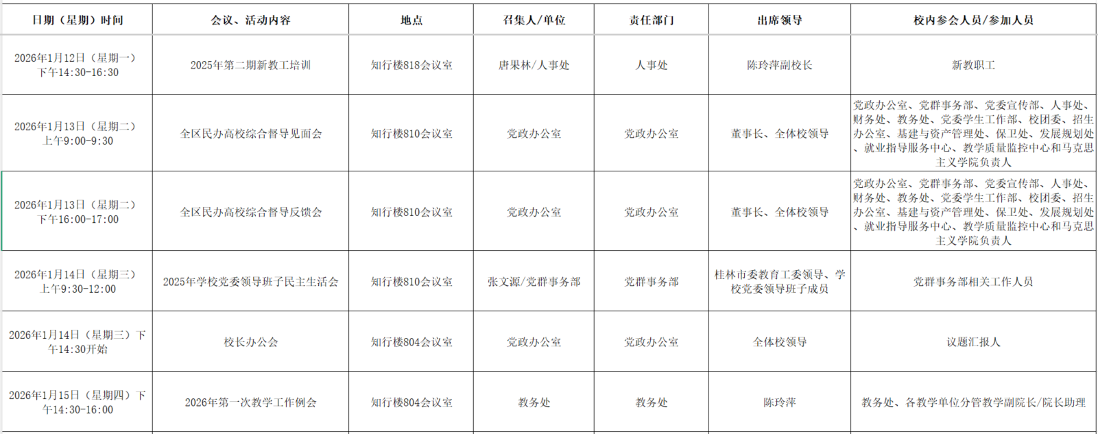 2025年秋季学期第二十周全校性会议活动安排表