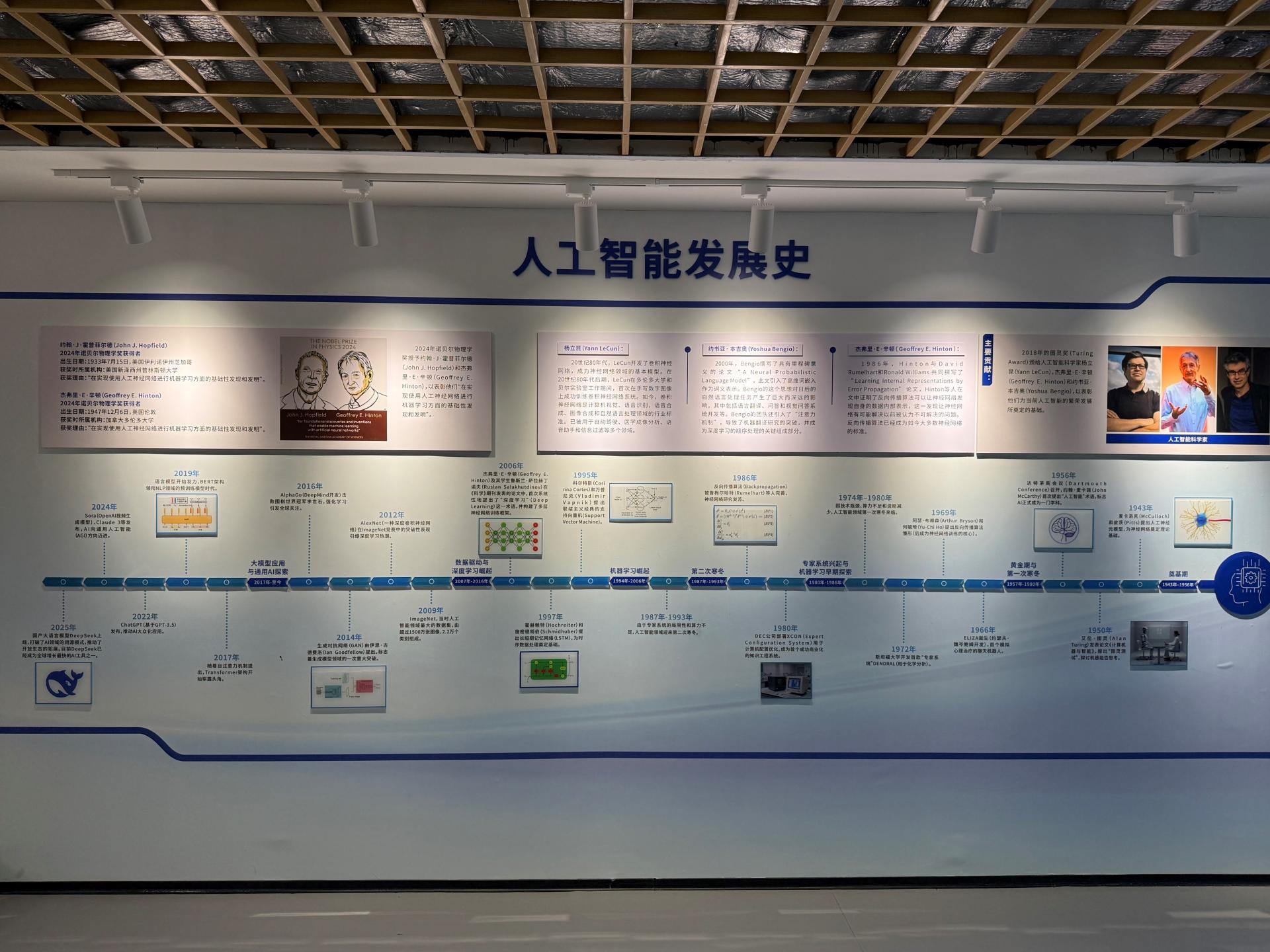 人工智能展区内,“人工智能发展史” 长廊宛如一部生动的科技编年史书,带您回溯人工智能的发展脉络。自 20 世纪中期人工智能概念提出以来,众多先驱者怀揣梦想踏上探索之路。在这里,您能了解到人工智能领域的先驱图灵,他提出的图灵测试为人工智能的定义与判定奠定了基础,如同在黑暗中点亮的第一盏明灯,指引着后来者不断前行。随着时间推移,深度学习迎来重大突破 ——2012 年,AlexNet 在 ImageNet 图像识别竞赛中一鸣惊人,以卓越表现展现出深度学习强大的图像识别能力,开启了人工智能发展的新篇章。此后,大模型如雨后春笋般涌现,凭借惊人的语言理解与生成能力,为自然语言处理等领域带来了翻天覆地的变化。展区内不仅有详实的历史资料和珍贵图片,还设置了互动体验装置,您可以亲自与智能语音助手交流,感受它快速准确的应答;也可以尝试操控智能机器人,体验其执行任务时的灵活与智能,沉浸式感受人工智能的独特魅力。