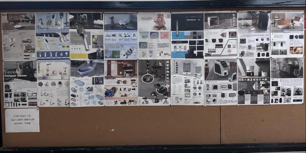 此次作品展作品来自严老师《设计心理学》这门课程,在家居清洁类、儿童用品等产品上,针对用户心理、行为、生理、反馈评级等方面进行产品调研,找准产品亮点,在此基础上进行产品的设计,并制作成展板进行展示。