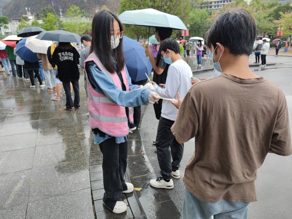 维护队伍秩序、给学生发棉签、扫码登记同学做核酸信息是他们的日常工作,同时创意设计学院学生党员先锋队还协助辅导员做好同学们疫情期间的心理疏导工作。