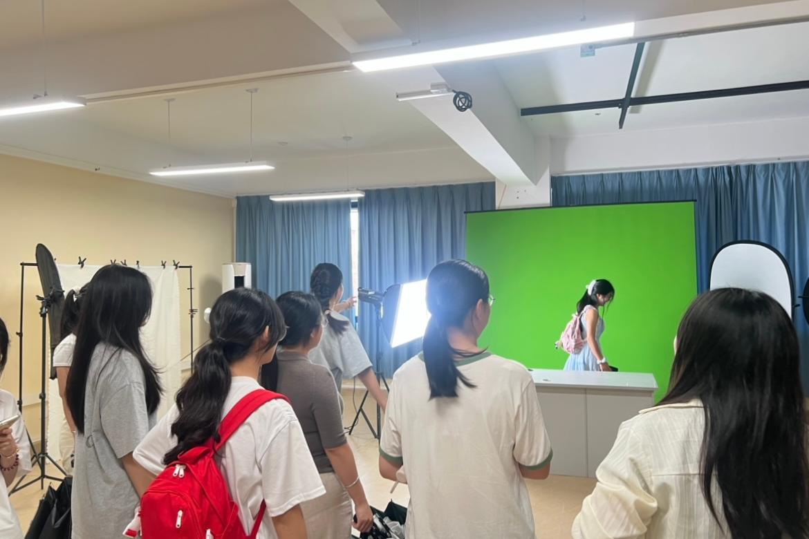 最后,参观队伍抵达守正楼G416影视跨文化工作室。这里配备的专业背景架、柔光箱、反光板等摄影辅助设备一应俱全,教师结合静物拍摄、人像拍摄实例,讲解了布光技巧、构图原则及场景搭建方法,并邀请几位同学现场体验模特与灯光调试环节,让大家在实践操作中理解理论知识的实际应用。