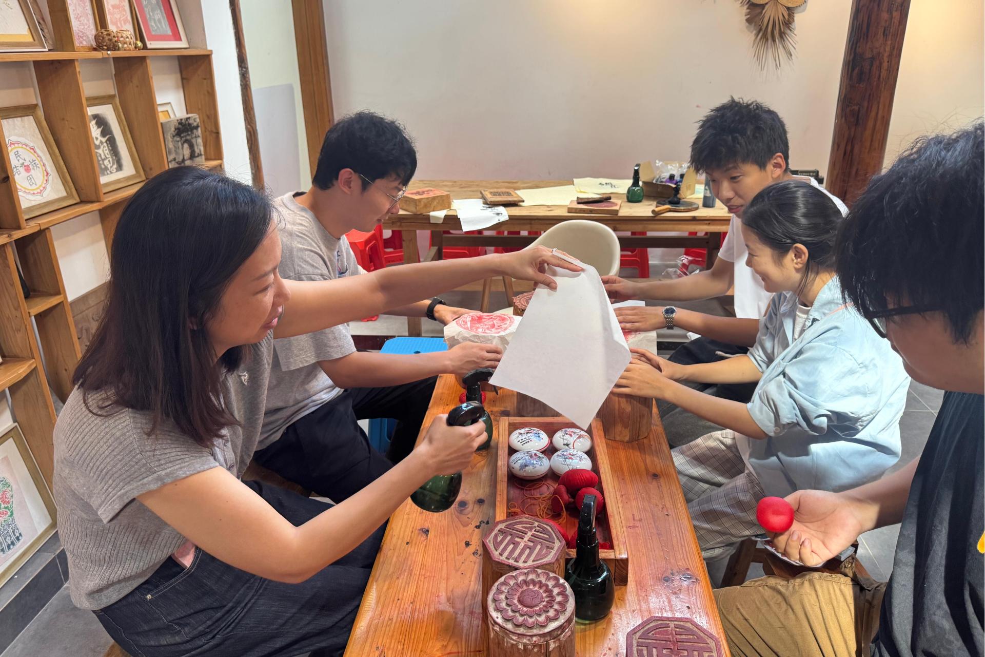 在东漓古村的传统手工艺工坊内,教师和学生们跟随当地非遗传承人系统学习拓印技艺的完整流程。从石料甄选、纹样勾描、上墨匀色到覆纸按压,传承人对每道工序的工具使用、力度把控和审美技巧进行细致讲解,教师和同学们亲手实践朱拓、墨拓等不同技法,在反复调试中感受传统工艺的严谨特质,体会工匠精神中蕴含的专注与坚守。