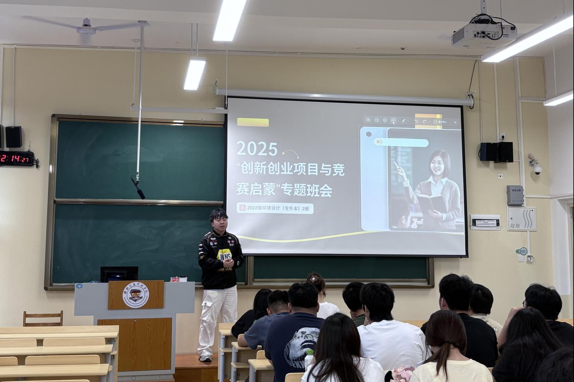 班会中,李运龙老师从创新创业项目申报、学科竞赛参与、团队组建等多个维度展开讲解。他特别强调环境设计专业学生要结合专业特色,关注乡村振兴、城市更新等热点领域,寻找创新突破口。为助力学生更好开展双创实践,李老师还分享了竞赛相关资源库,提供了部分参考信息,帮助学生拓宽思路。讲座最后设置了互动答疑环节,同学们踊跃提问,现场气氛热烈。