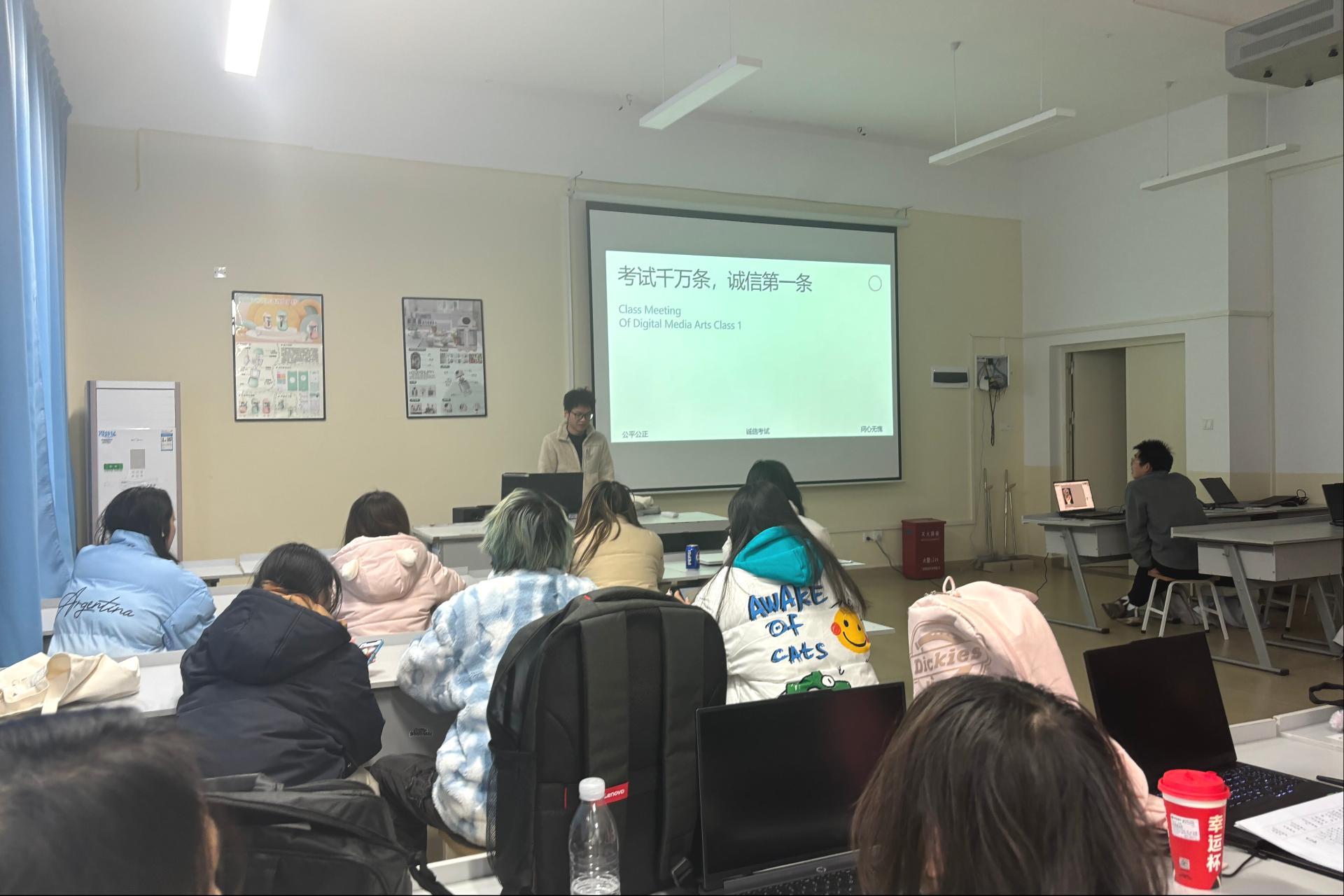 临近期末考试周,为强化学生的诚信意识,营造公平公正的考试环境。2024级数字媒体艺术1班在黄增扩老师的带领下于12月19日展开了以“考试千万条,诚信第一条”为主题的班会活动。此次班会,全班同学踊跃参与,态度积极,班会成效显著。