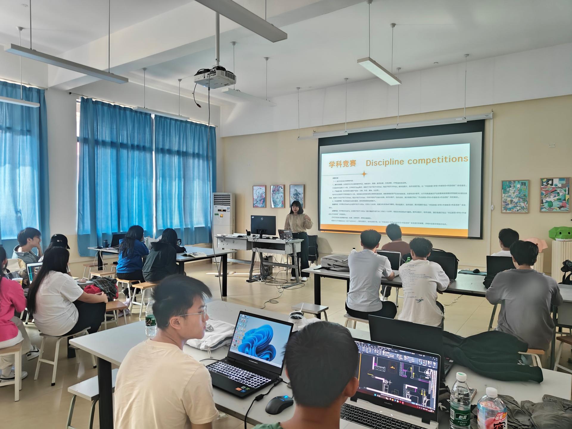 在班会中,学业导师王欣乐向学生们介绍了学科竞赛的重要性,还鼓励学生们踊跃参赛,以赛促学,以赛促创,进一步提高自身综合素质,提升学生的创新实践能力和团队协作精神。此外,还鼓励同学们关注“设计赛”与“设计赛事”两大公众号,以便及时且详细了解设计类相关竞赛的信息。