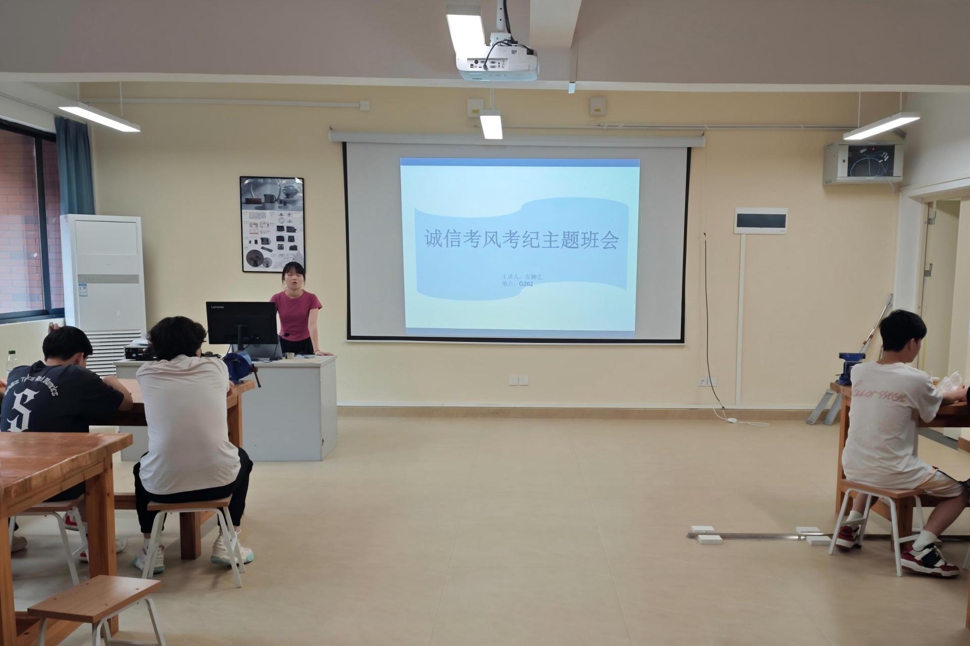 为进一步加强学风建设,营造公平公正的考试环境,创意设计学院2024级产品设计2班于6月18日在守正楼G202教室成功举办了以“诚信考风考纪”为主题的班会活动。本次班会由学业导师兼班主任张柳芝主持,班会旨在增强同学们的诚信意识,自觉抵制考试作弊行为,共同维护良好的考试秩序。
