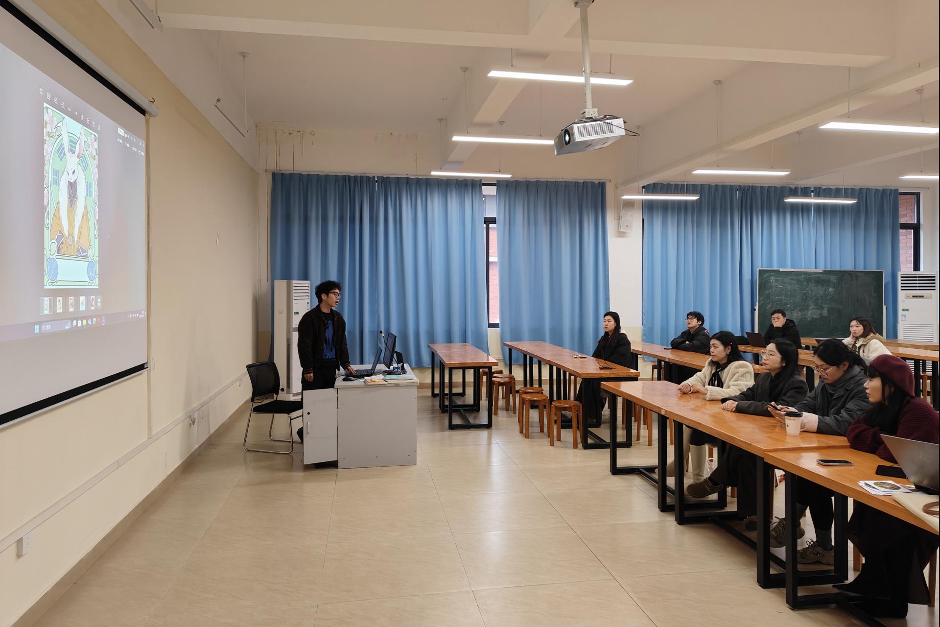 本次活动在E416教室拉开帷幕,从数字插画到动态动画,从角色设计到三维建模,每一件作品都凝聚了师生们的心血与创意。数字媒体艺术教研室教师们在此次展示活动中扮演了至关重要的角色,他们不仅是创作的指导者,更是学生灵感火花的点燃者。从项目构思到技术实现,教师们全程参与,耐心解答学生的疑问,提供专业指导,确保每一件作品都能达到最佳呈现效果。