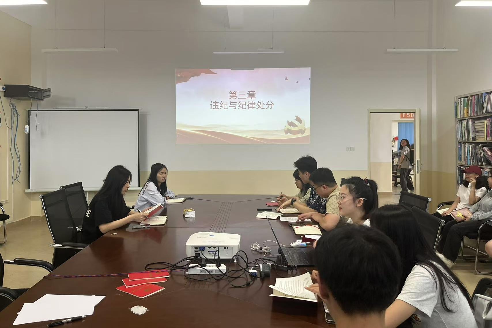 此次会议内容主要为学习《中国共产党纪律处分条例》总则中的第二章至第五章。刘思书记强调,要把纪律建设摆放在更加突出位置,将习近平总书记关于全面加强党的纪律建设的重要论述转化为纪律要求,为推进全面从严治党提供坚强纪律保障。在会议交流环节,钟晓婷同志表示:“作为新发展的预备党员,通过此次学习,我深刻感受到纪律建设的重要性。《中国共产党纪律处分条例》中的每一条规定,明确了党员的行为规范,我将会在今后学习和工作中根据党纪内容严格要求自己。”