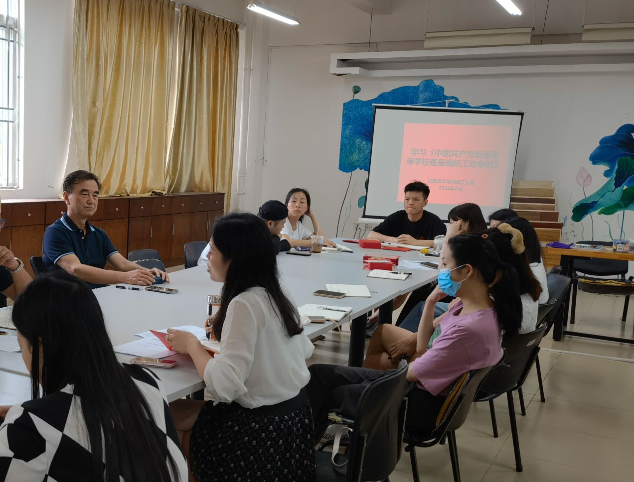 2022年6月10日、6月13日,创意设计学院教工党支部、第一、第二学生党支部分别于42201、42406教室开展专题学习《中国共产党普通高等学校基层组织工作条例》学习会,活动由教工党支部书记田婧、组织员陈韵姿主持,各支部党员参加。
