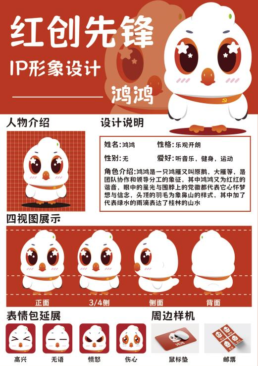 “鸿鸿”的设计蕴含浓厚的党建底色与先锋气质。其脖颈间的飘带巧妙融合党章元素,眼瞳中点缀的五角星,不仅鲜明呼应“党建红”的政治属性,更烘托出先进团队的先锋氛围,向师生传递“心怀信念、向阳而行”的价值追求。地域文化标识的融入让“鸿鸿”更具辨识度。形象头顶的羽毛复刻桂林象鼻山的独特轮廓,其中镶嵌的绿色水滴浓缩桂林山水灵秀之气,既彰显地域文化特色,更暗含学院“立足桂林、服务地方”的育人定位,实现党建品牌与地方文化的有机衔接。在情感传递与色调设计上,“鸿鸿”以柔和的白、红为主色调,搭配粉扑扑的腮红与星星眼的萌态造型,既传递出“互帮互助、温暖协作”的情感温度,也精准契合美育“以美化人”的温柔内核。而“鸿鸿”的命名,既与“红创红”中“红红”谐音呼应,更寄托着学院师生“鸿鹄之志、红心向党”的美好期许。