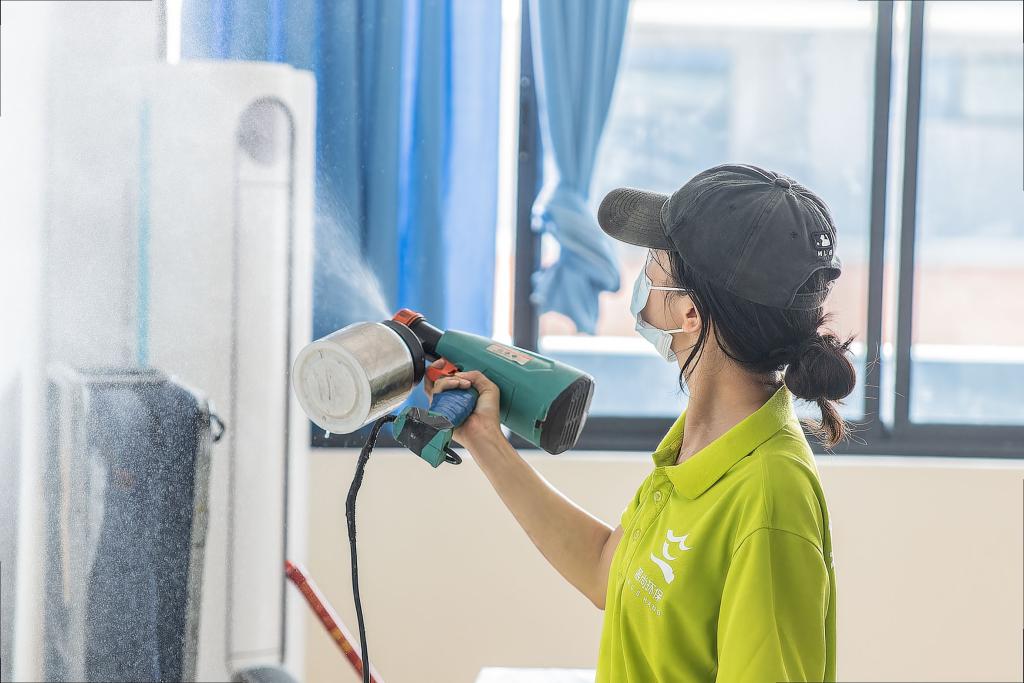 近日,学校请专业团队使用甲醛清除剂,对办公室、公寓、教室、图书馆等所有的柜子、桌椅、门窗进行全方位高压雾化喷涂,清除板材内存留甲醛,对于难以清理的地方,工作人员使用专业强力清除剂进行反复的喷涂处理,确保清除效果。