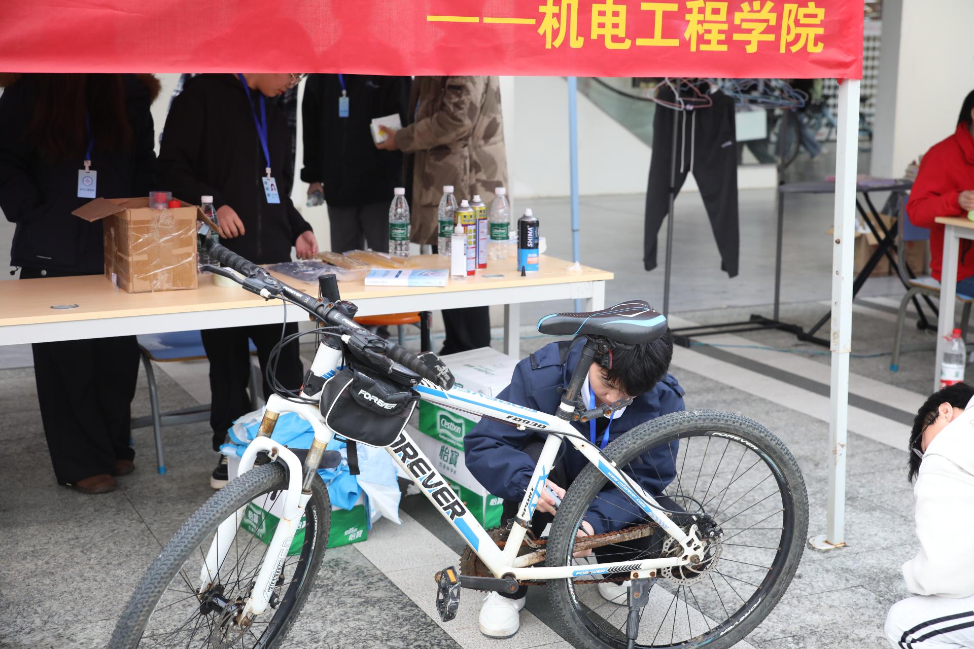 机电工程学院举办“爱心骑行,践行初心”主题活动,免费为师生检修自行车,普及绿色低碳出行理念。