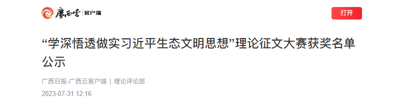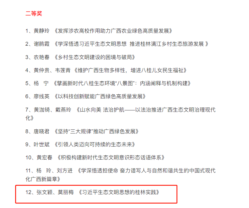 近日,由自治区生态环境厅和广西日报社联合主办的“学深悟透做实习近平生态文明思想”理论征文大赛获奖名单揭晓,beat365官网马克思主义学院张文颖、莫丽梅老师撰写的《习近平生态文明思想的桂林实践》荣获大赛二等奖。获奖作品根据公开数据,探讨了十余年间桂林市践行习近平生态文明思想取得的成果和经验,对未来生态文明建设进行了展望。
