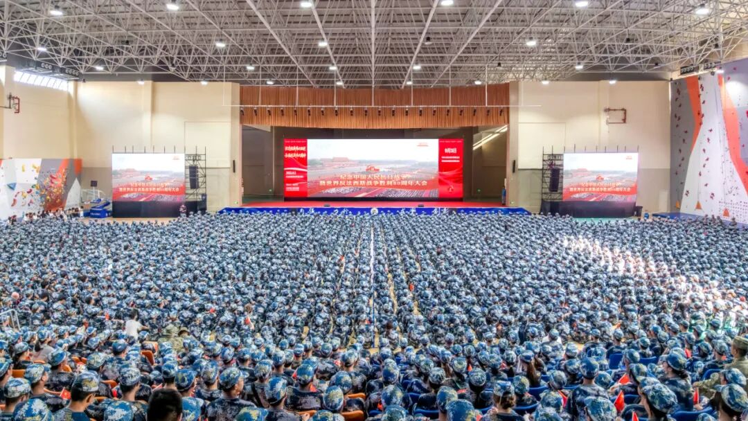 纪念大会正式开始前,行健楼观看现场已然洋溢着澎湃的爱国热情。放眼望去,舞动的五星红旗在行健楼会场猎猎生风,汇成一片壮观的红色海洋,彰显着新时代信科人的爱国热忱与使命担当。