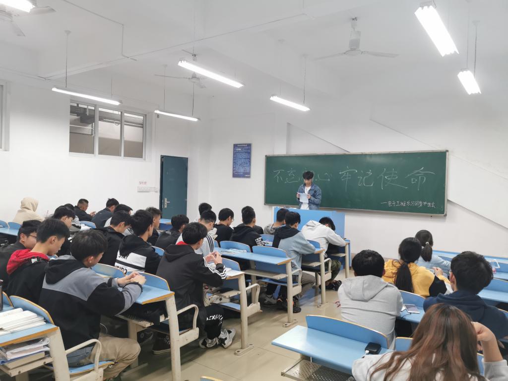 11月19日,电子工程系分团委学生会在42307教室分批次开展“不忘初心、牢记使命”主题团课,系分团委学生会学习部部长韦晓晓担任主讲人,19级全体学生参加本次学习。