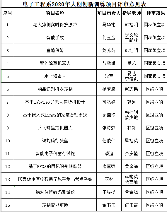 近日,2020年全院大创项目立项评审结果公布。电子工程系师生积极参与本次大创项目申报,认真准备申报材料。经过评审专家严格、公正审核,最终我系15项大创项目入选国家级、区级大学生创新创业训练计划,其中国家级5项,区级10项。