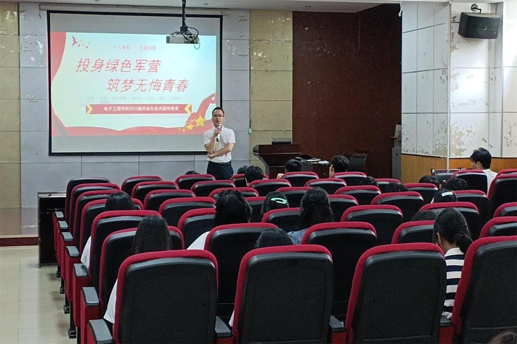 为响应国家征兵号召,扎实做好2023年秋季征兵工作,使同学们进一步了解大学生应征入伍的相关政策,鼓励和引导大学生积极应征入伍,4月18日下午,电子工程学院在21201报告厅开展2023年大学生入伍政策宣讲暨征兵动员会,会议由毕业班辅导员欧盛福主讲,100多名毕业生参加本次会议。