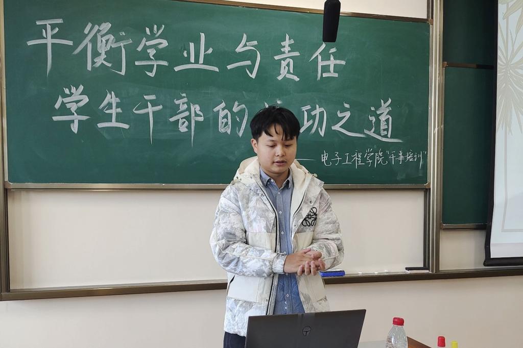 为帮助学生干事处理好学业和学生工作之间的关系,促进学生干事综合素养全面提升。12月21日,电子工程学院在D509教室开展学生干事专题培训会。本次会议由曾桐宇老师担任主讲,电子工程学院分团委学生会全体成员参加。