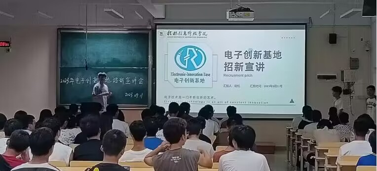 为让2023级的新生,点燃对科学、传播科学和实践科学的热忱、促进科教兴国的发展、进一步加深学生对我院的了解。9月11日至13日,电子工程学院在C308教室开展电子创新基地的招新宣讲,本次会议由电子创新基地成员主讲,2023级新生分批次参加会议。