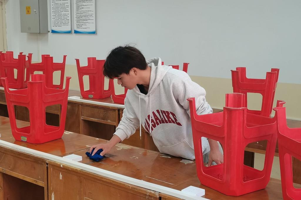 活动开始前,115名志愿者分为二十一个小组,分别对A101、A102、A104等二十一间实验室进行清扫。活动开始,志愿者拿好清扫工具分组前往各个实验室,大家各司其职,用扫把、拖把清理地面的灰尘和杂物,用抹布等工具擦拭窗户上的污渍,同时小心地摆放实验仪器,打扫每一个卫生死角。经过一个多小时的清扫,二十一间实验室进行了彻底的清洁。