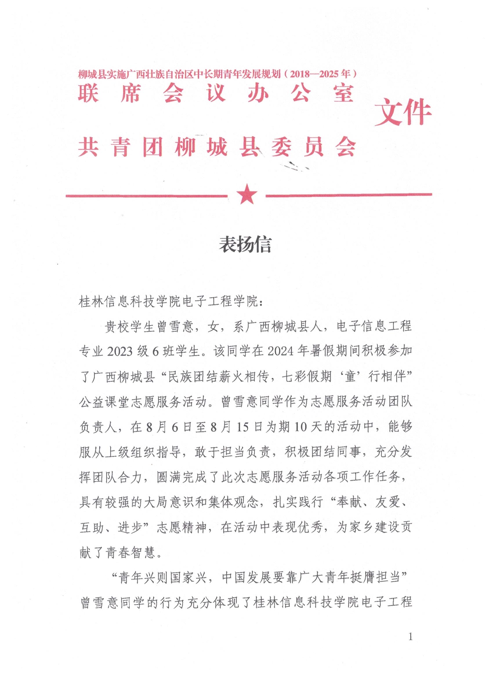 近日,共青团柳城县委员会向电子工程学院发来表扬信,对学院2023级电子信息工程专业曾雪意同学在大学生“返家乡”社会实践活动中积极团结同事,高效开展志愿服务工作展示出的责任担当表示高度肯定和赞扬,同时也对beat365官网人才培养工作给予了赞赏。