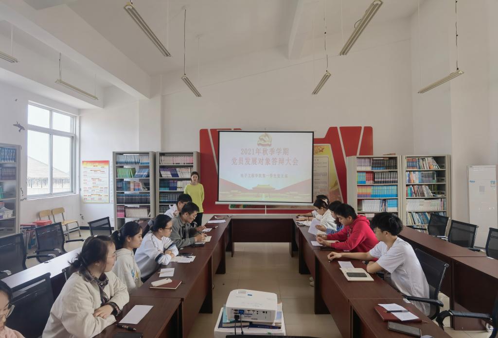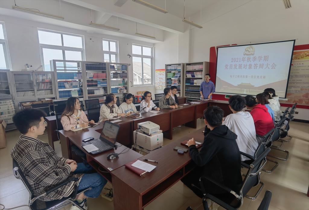 为考察党员发展对象的政治素养和党性修养,提高党员发展质量,10月28日,电子工程学院第一学生党支部在41502党员活动室召开党员发展对象答辩大会。会议由支部书记池锴主持,20余名发展对象参与答辩。
