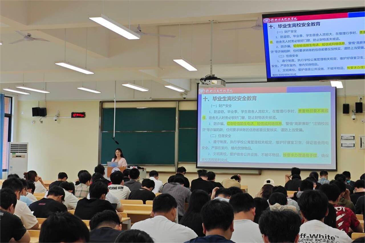 为切实做好毕业生文明离校工作,增强学生安全意识,确保离校期间校园安全稳定。近日,电子工程学院毕业班辅导员组织全体毕业生召开离校安全教育会,通过案例警示、政策解读和暖心寄语,为毕业生上好“最后一堂安全教育课”。