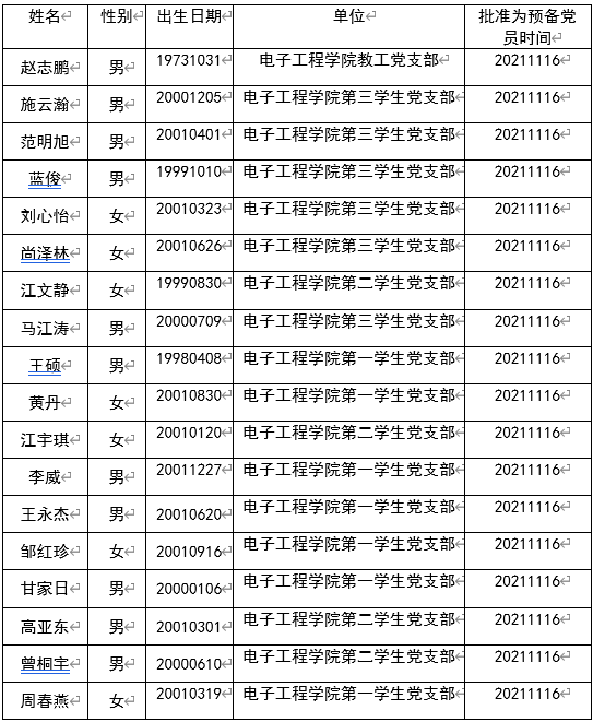 以上预备党员转正名单公示的期限为5个工作日,自公示之日起,个人和单位发现公示对象存在不符合预备党员转正条件问题的,可向所在单位党支部或上级党组织反映举报,举报人应提供反映被举报人问题的具体事实线索,署真实姓名和单位,否则不予受理。电子工程学院党总支负责为举报人保密。举报电话:0773-2290572,电子工程学院组织员:陈义红。