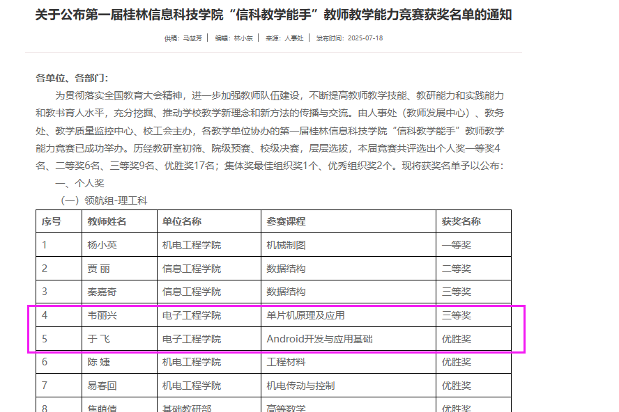 在本次竞赛中,我院教师凭借出色的教学能力和创新精神,在激烈的竞争中脱颖而出。其中,鲍康乾老师荣获启航组第一名,梁艳燕老师获得启航组第三名,韦丽兴老师斩获领航组第三名。此外,于飞、冯慧玲两位老师凭借优异表现荣获优秀奖。同时,我院还凭借精心的组织工作和突出的团队表现,荣获最佳组织奖,彰显了学院在教学管理与教师培养方面的卓越成效。