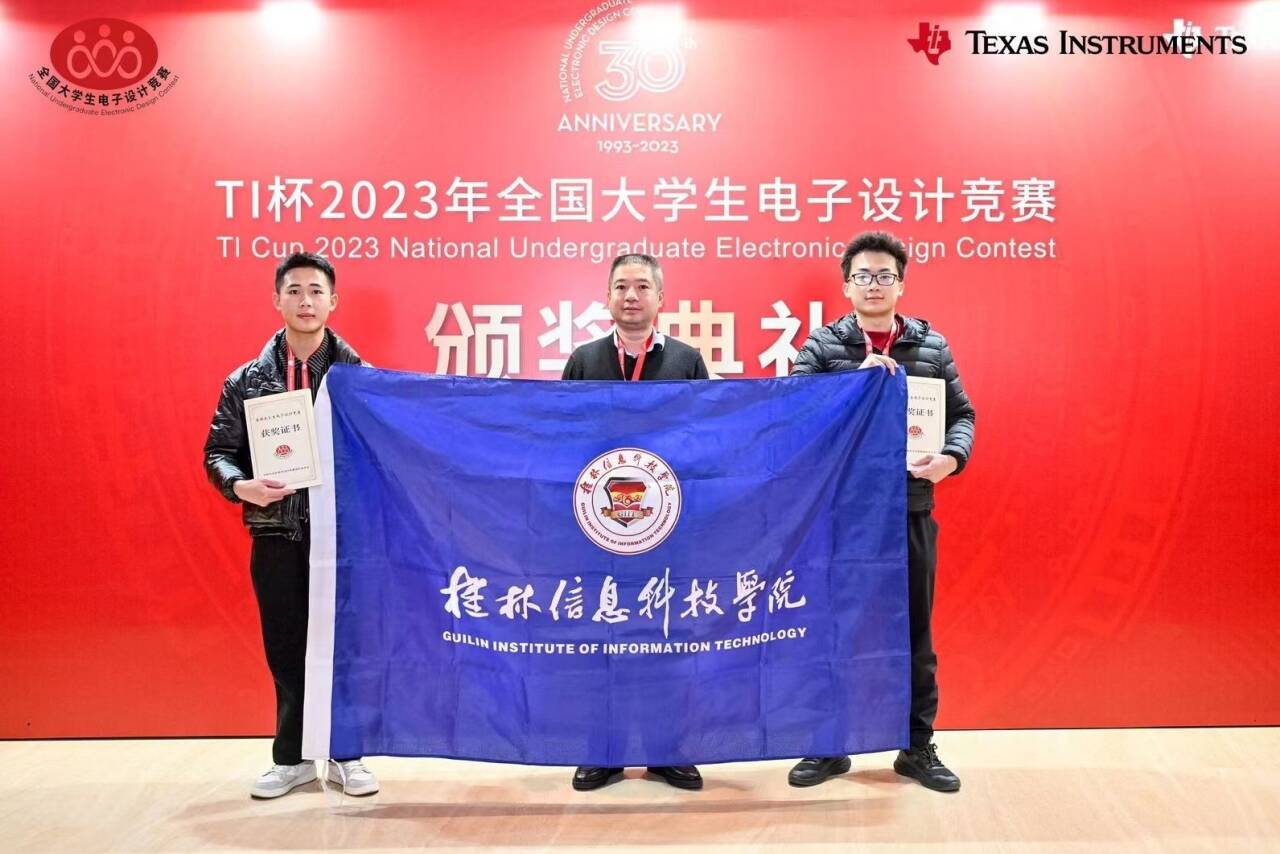 11 月 19 日,2023 年度 TI 杯全国大学生电子设计竞赛颁奖典礼暨全国大学生电子设计竞赛 30 周年庆典在北京隆重举行,全国优秀参赛队伍代表受邀前往北京接受表彰。beat365官网电子工程学院获奖指导教师代表韩桂明和学生代表秦发胜、梁璐受邀参加此次盛会。