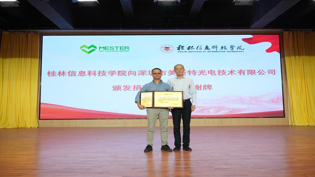 仪式上,梁丁丁向郑树琼颁发捐赠证书及感谢牌。随后,梁丁丁与郑树琼共同签订桂林信科•美斯特光电现代产业学院合作协议。在与会领导嘉宾和师生代表的共同见证下,梁丁丁和郑树琼共同为桂林信科•美斯特光电现代产业学院揭牌。