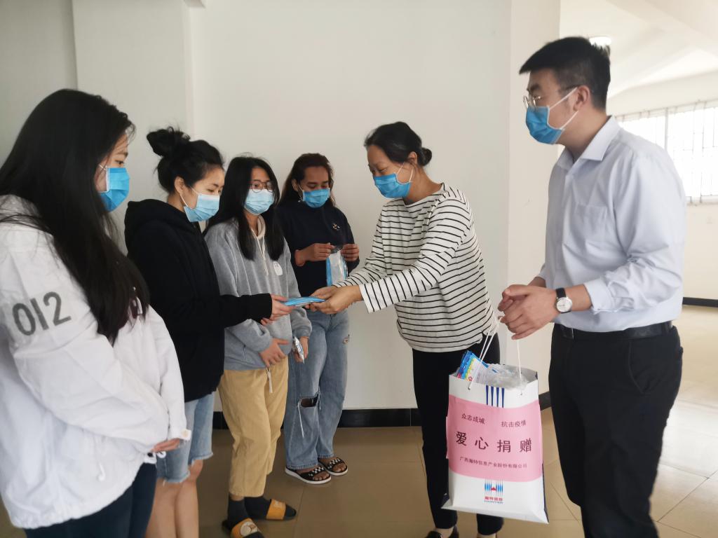 黄晓玲部长对留学生们表示关心和慰问,亲切询问学生的生活情况和自我防护情况,叮嘱学生服从防疫防控安全管理,安心地学习和生活。随后,黄晓玲部长对全部留学生逐一进行体温测量,耐心地向留学生说明和展示体温数据,并和李刚书记一同向留学生们发放医用一次性口罩、体温计及防疫宣传手册等防疫物资。