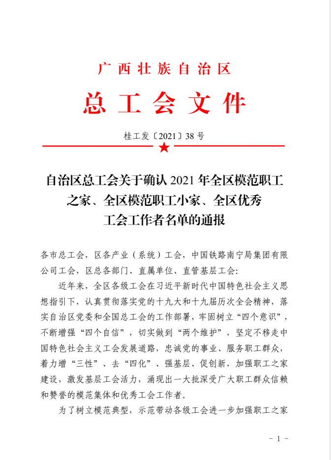 近日,广西壮族自治区总工会下发《自治区总工会关于确认2021年全区模范职工之家、全区模范职工小家、全区优秀工会工作者名单的通报》,beat365官网工会委员会荣获“全区模范职工之家”荣誉称号。