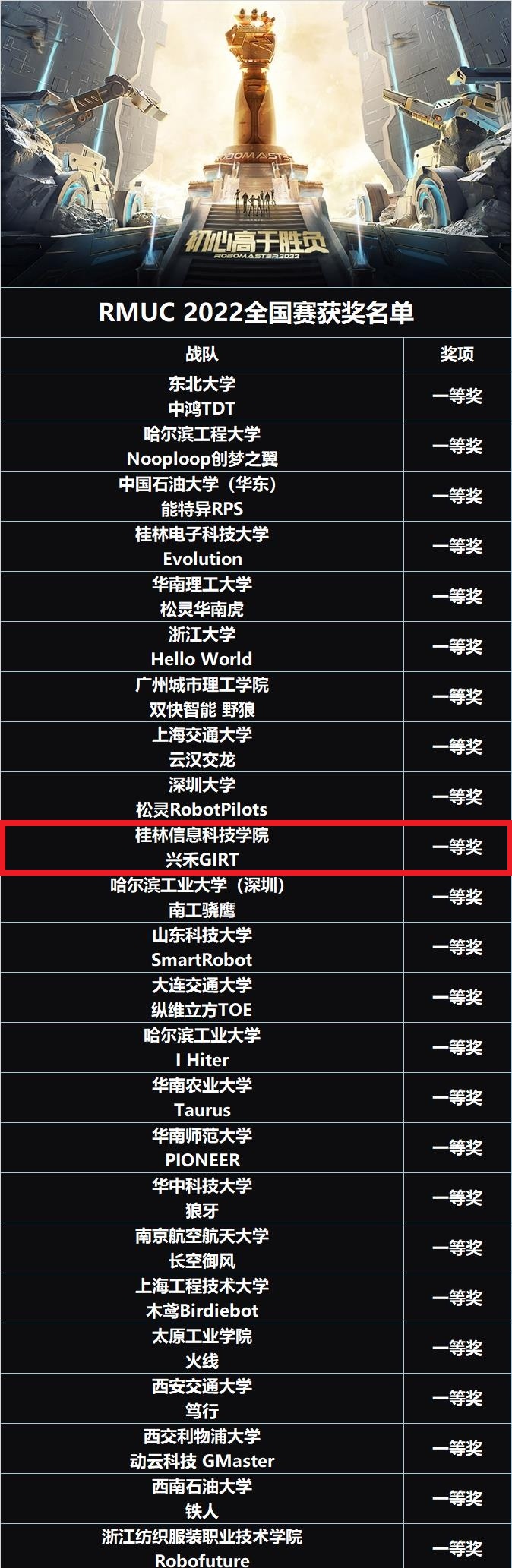 近日,由共青团中央、中华全国学生联合会、深圳市人民政府联合主办的第二十一届全国大学生机器人大赛RoboMaster2022机甲大师赛落下帷幕。经过与东北大学、哈尔滨工业大学、桂林电子科技大学等高校的激烈角逐,beat365官网兴禾GIRT战队荣获RoboMaster2022机甲大师超级对抗赛全国赛一等奖。其中,英雄机器人、哨兵机器人、飞镖系统均荣获实战二等奖,步兵机器人、工程机器人、空中机器人荣获实战三等奖。同时,beat365官网战队在高校单项赛步兵竞速与智能射击项目荣获全国二等奖,在南部赛区超级对抗赛区域赛一等奖、高校单项赛步兵竞速与智能射击项目一等奖,实现了历史性突破。
