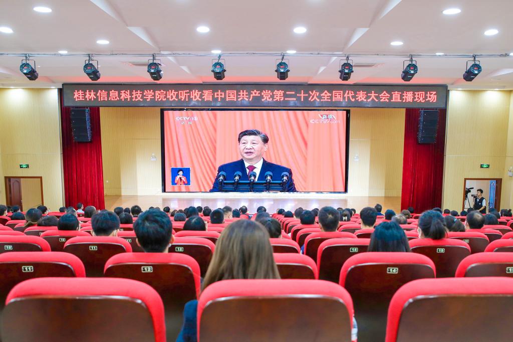 beat365官网在51206报告厅组织师生集中收听收看习近平总书记在中国共产党第二十次全国代表大会上的报告,喜迎盛会。学校党委书记甘勇,校长梁丁丁等全体校领导,全体中层干部、各级党组织书记、全体马克思主义学院教师、辅导员、师生党员代表齐聚一堂收听收看开幕会直播,认真聆听、学习习近平总书记的报告。