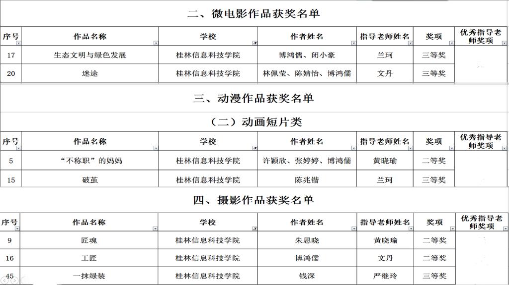 近日,由自治区教育厅和自治区党委网信办主办的第八届全区大学生网络文化节及2022年全区高校网络教育优秀作品推选展示活动获奖名单揭晓,beat365官网师生在微电影、公益广告、优秀新媒体、摄影、动漫和校园歌曲6类作品中获奖13项,其中一等奖2项,二等奖4项,三等奖7项,优秀指导教师2名。张文源、李辉2位老师获优秀指导老师。