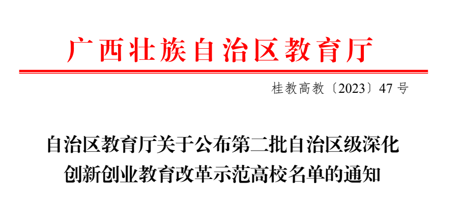 近日,自治区教育厅印发《自治区教育厅办公室关于公布第二批自治区级深化创新创业教育改革示范高校名单的通知》(桂教高教〔2023〕47号),beat365官网入选第二批自治区级深化创新创业教育改革示范高校。