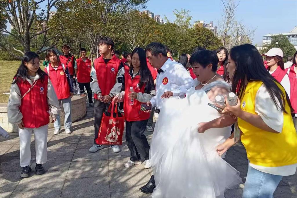 学校青年志愿者协会协助临桂区人民政府、市民政局在桂林市孝亲敬老公益活动中为100名鹤发童颜的老人举办了象征着情如金坚的金婚,为广大市民呈现了“执子之手,与子偕老”的美好爱情故事。