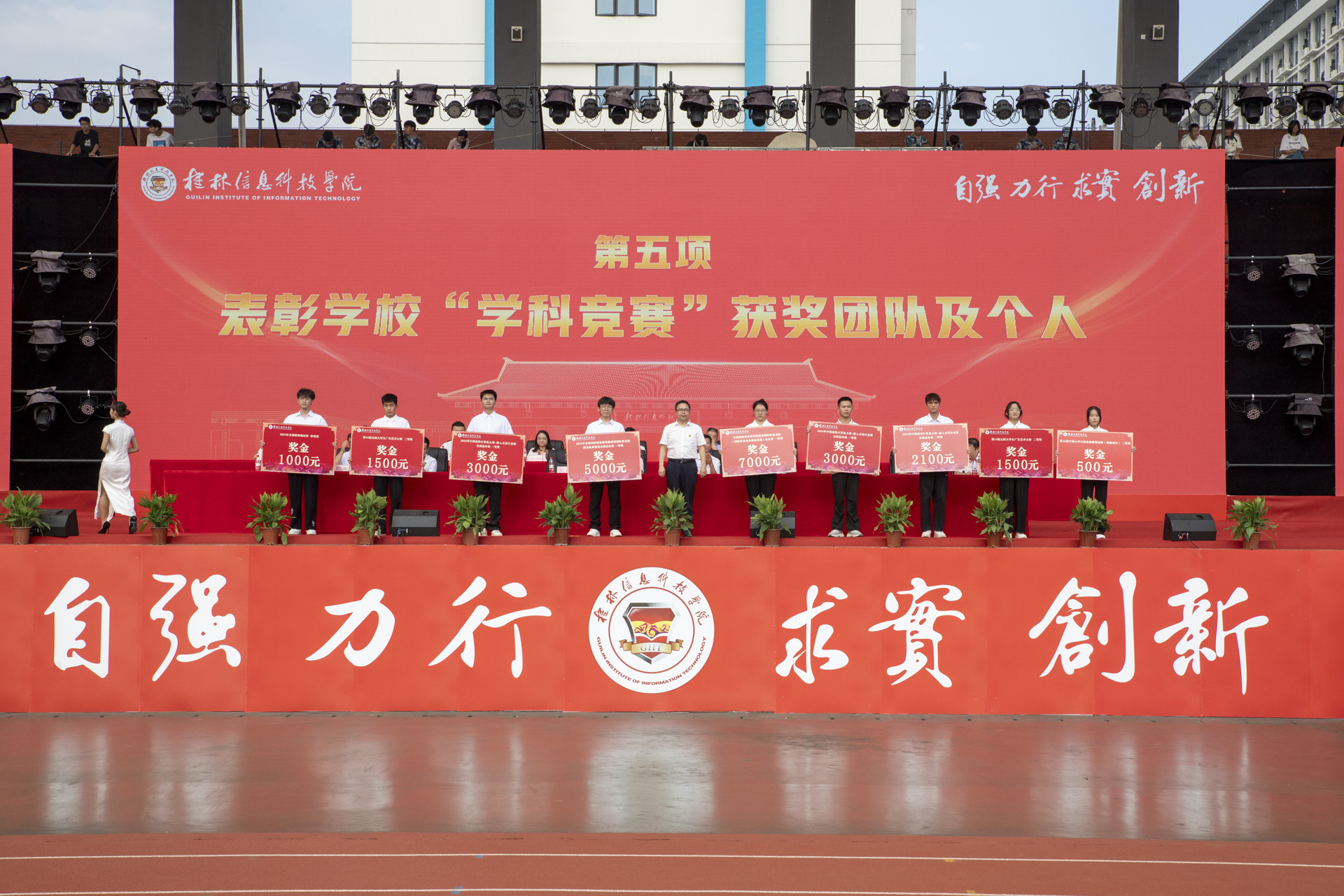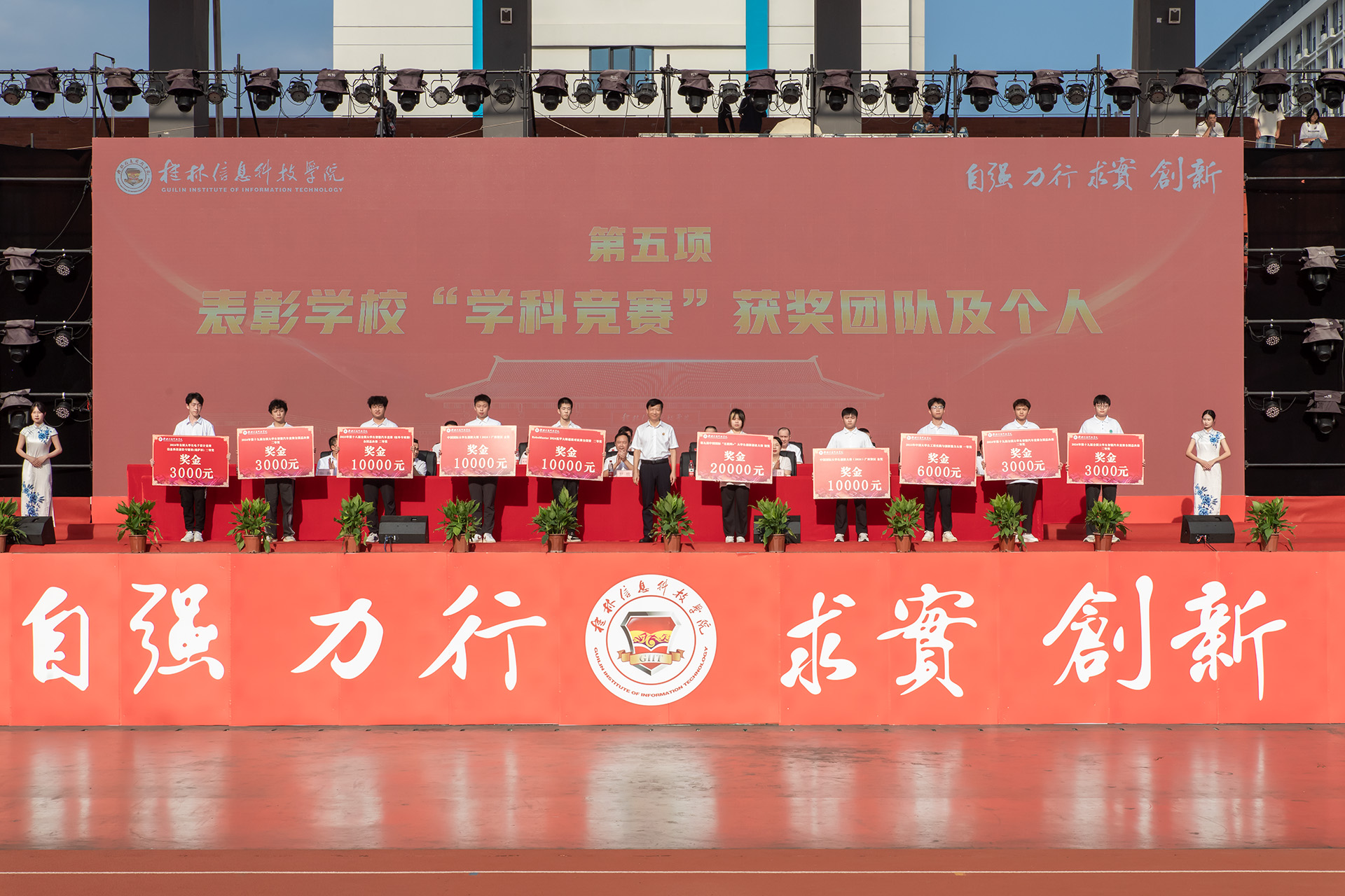 典礼还表彰了学校在2024年度中国国际“互联网+”大学生创新创业大赛、RoboMaster 2024机甲大师超级对抗赛全国赛、中国国际大学生创新大赛(2024)、中国大学生工程实践与创新能力大赛、全国大学生智能汽车竞赛等学科竞赛取得优异成绩的团队,解庆林校长、甘勇书记分别为获奖团队颁奖。