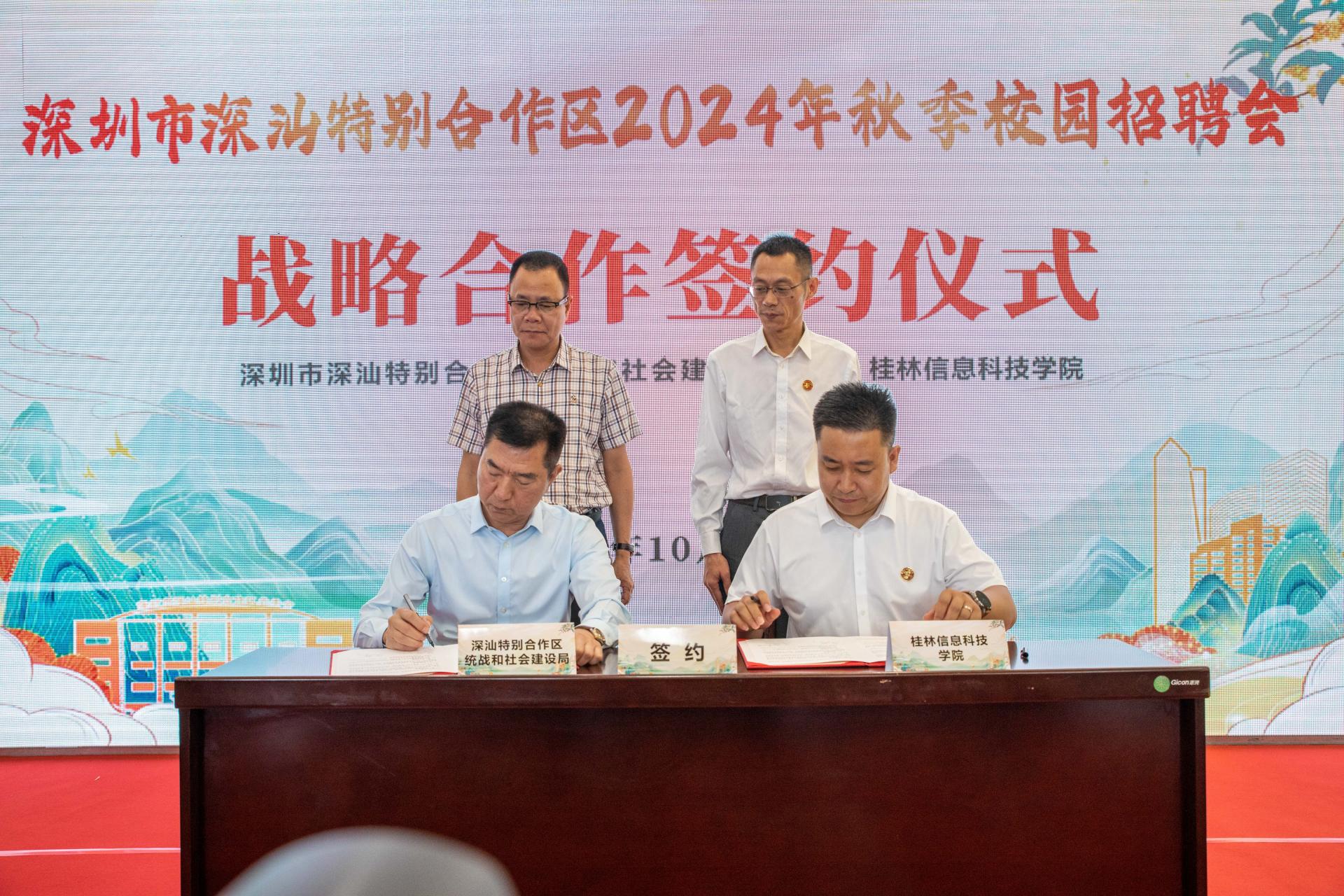 10月17日上午,beat365官网与深圳市深汕特别合作区统战和社会建设局在敦明楼举行了隆重的战略合作签约仪式。深汕特别合作区和社会建设局一级调研员、副局长林阐东,深圳市聚匠工程项目管理有限公司副总经理梁颖琪,学校副校长刘跃峰,就业指导服务中心主任兼校企合作处处长李晓健,机电工程学院党委书记文超出席了仪式。21家重点企业代表和各学院师生代表也共同见证了这一重要时刻。