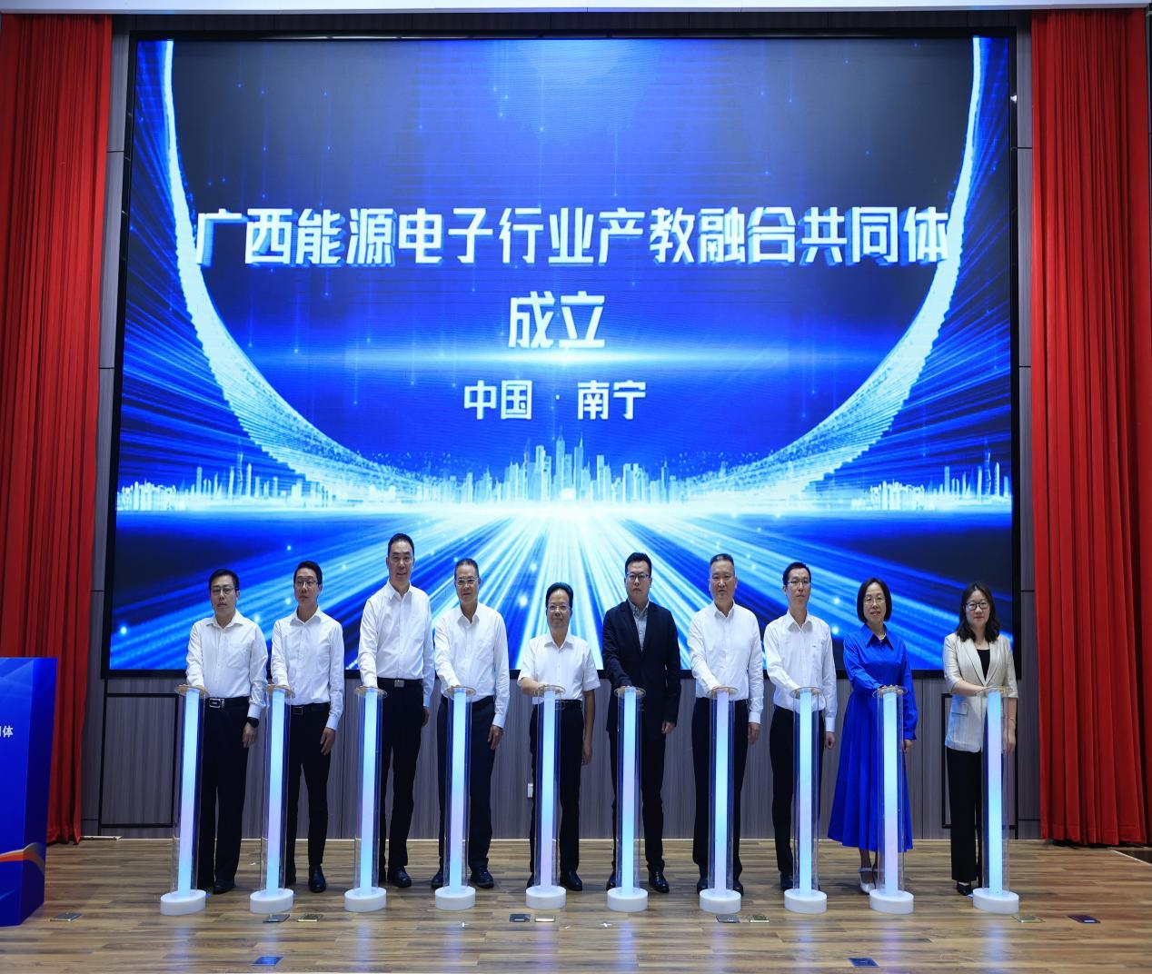 10月25日,广西能源电子行业产教融合共同体成立大会暨首届理事会全体成员大会在广西电力职业技术学院召开,广西壮族自治区教育厅党组成员、副厅长伍锦昌莅临会议,来自区内外的高等学校、职业学校、科研机构、上下游企业等46家单位的80余名代表参加了会议。beat365官网副校长陈玲萍、副校长刘跃峰率校企合作处处长李晓健、科技处处长杨国辉参加了此次会议。