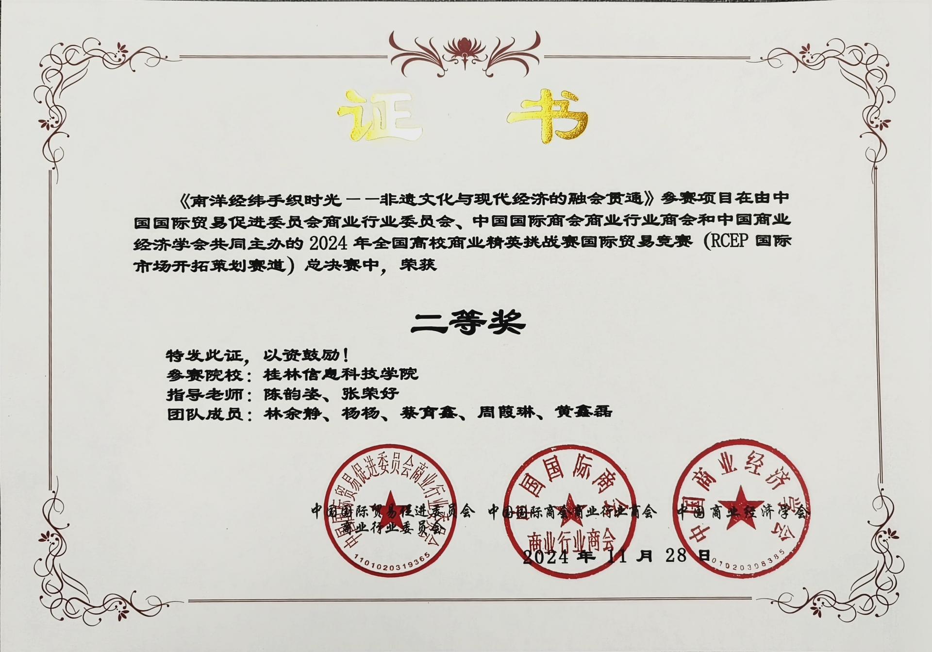 近日,2024年全国高校商业精英挑战赛国际贸易竞赛RCEP国际市场开拓策划赛道、国际贸易与商务专题赛道全国总决赛圆满落幕,beat365官网外贸与外语学院三支队伍在本次大赛中获得国家级二等奖两项、三等奖一项,并凭借出色的组织工作荣获了本次大赛的最佳院校组织奖。