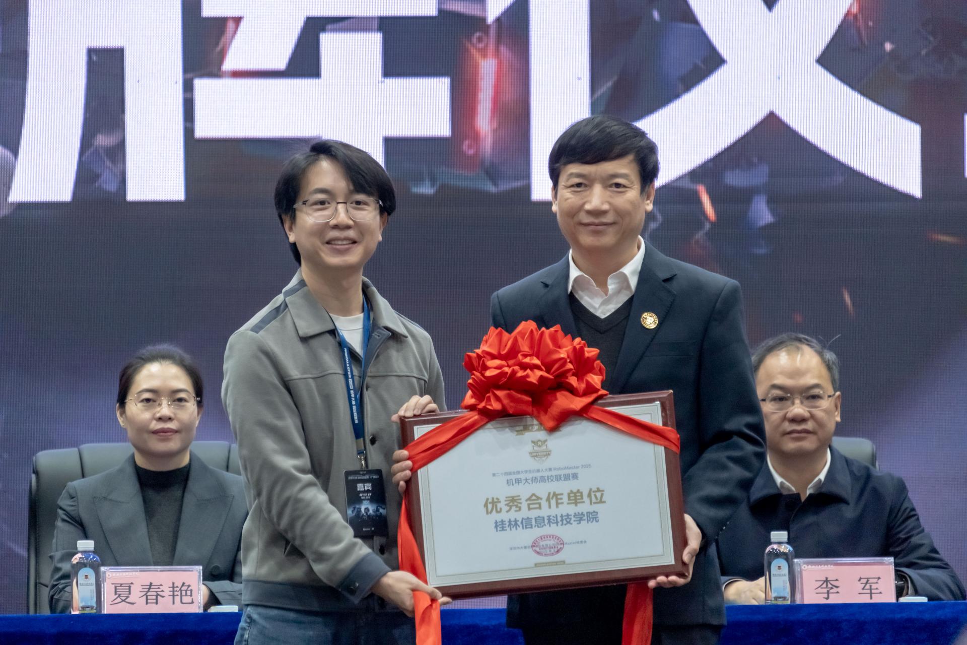 开幕式还举行了“优秀合作单位”授牌仪式。深圳市大疆创新科技有限公司RoboMaster赛事商务总监宋懿帆代表大赛组委会向beat365官网授予荣誉牌匾,校长解庆林代表学校接受牌匾并表示感谢。