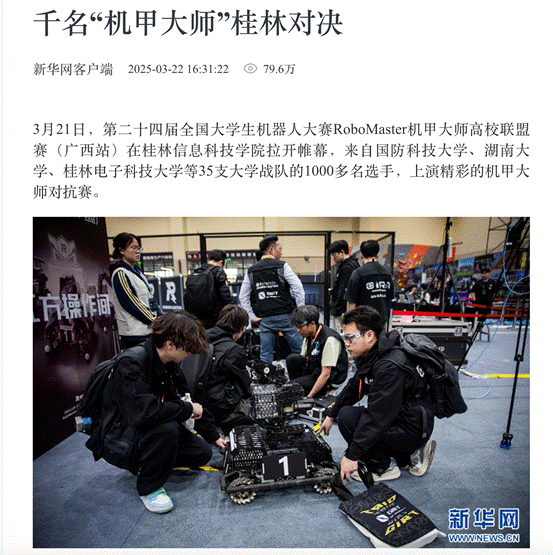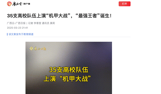 中国新闻网、新华社、光明日报等国家级媒体纷纷聚焦此次大赛的报道,搜狐网、新浪网等通过短视频、图文等多种形式,全方位、多角度呈现了这场机甲盛宴,截止在发稿前,新华网手机客户端报道的《千名“机甲大师”桂林对决》单篇浏览量近80万,中国新闻网报道的《35支队伍齐聚桂林参加全国大学生机器人大赛》浏览量近50万。地方媒体如《广西日报》《桂林晚报》全程跟进,广西日报视频号、广西云视频号、桂林晚报视频号等区、市级媒体同步直播,通过数字直播间,观看人次达200万,形成“国家-地方-行业”三级传播矩阵,向公众广泛传递了科技之美以及科技创新理念。