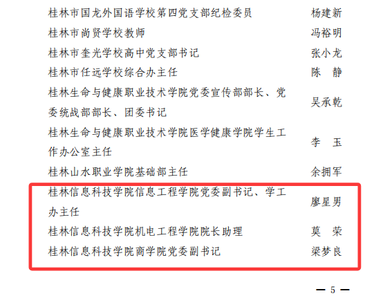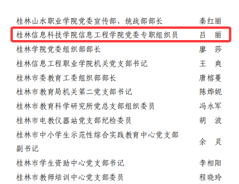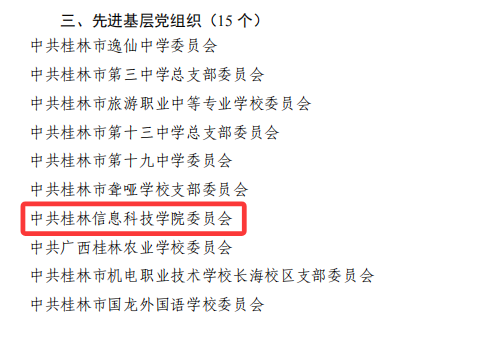 近日,桂林市委教育工作委印发《中共桂林市委员会教育工作委员会关于表彰2025年度桂林市直属教育系统优秀共产党员 优秀党务工作者 先进基层党组织的决定》(市委教工委〔2025〕25 号),学校党委获评“先进基层党组织”荣誉称号,廖星男等6名同志获评“优秀共产党员”荣誉称号,吕丽同志荣获“优秀党务工作者”荣誉称号!