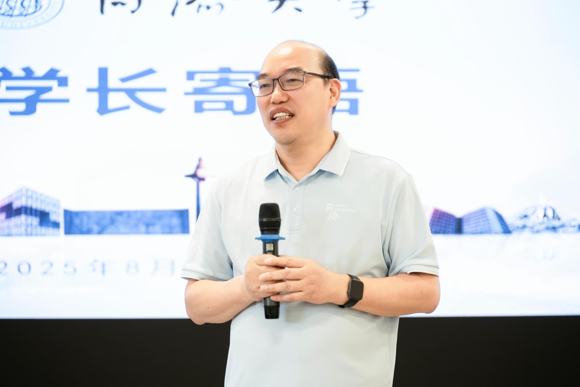 随后,同济大学测绘与地理信息学院党委书记楼立志代表学校向全体新生表示祝贺。他介绍了同济大学在科研平台、学习资源等方面的丰富资源,并希望新生们能够尽快适应大学生活。