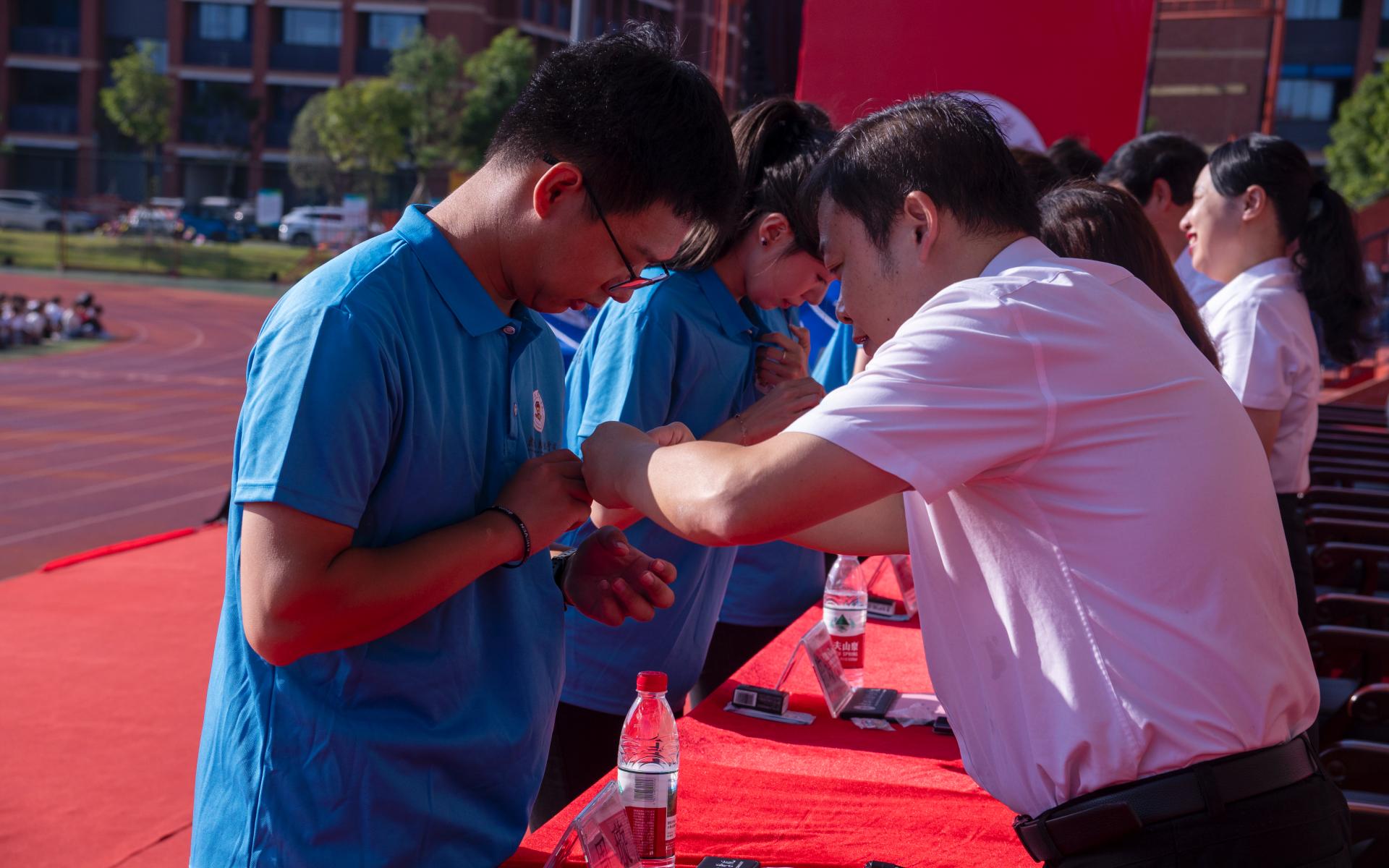 主席台领导为新生代表戴校徽