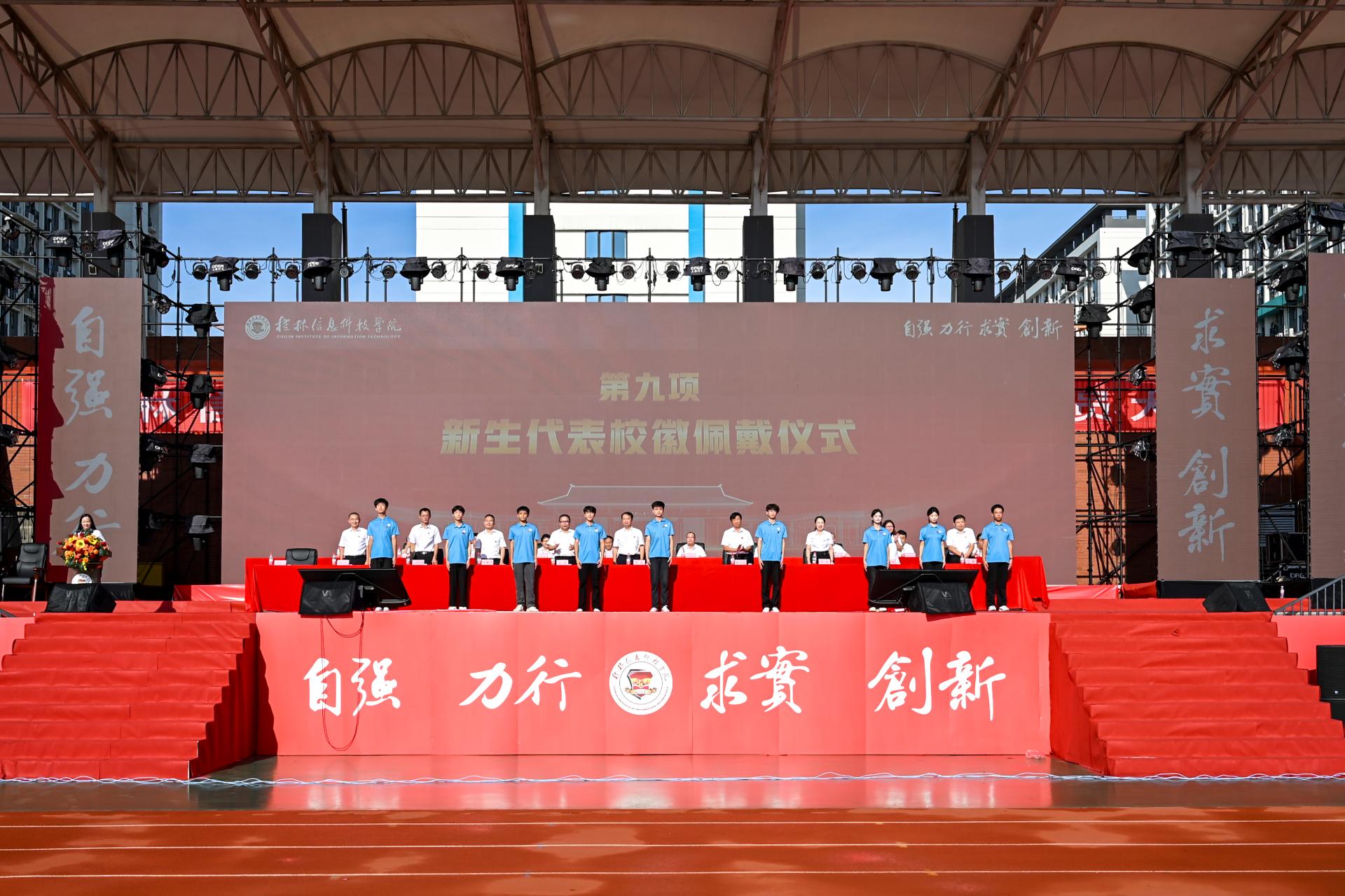 在新生佩戴校徽环节上,主席台领导为新生代表戴上了学校校徽,既是一种传承,也是一种期望,希望同学们做一个有理想、敢担当、能吃苦、肯奋斗的新时代好青年。随后,2025级机电工程学院代冰哲同学带领全体新生宣誓。