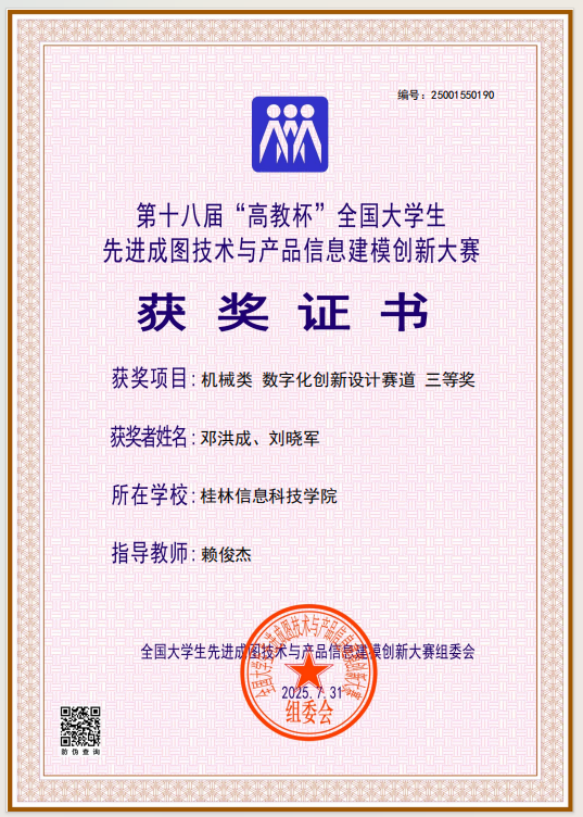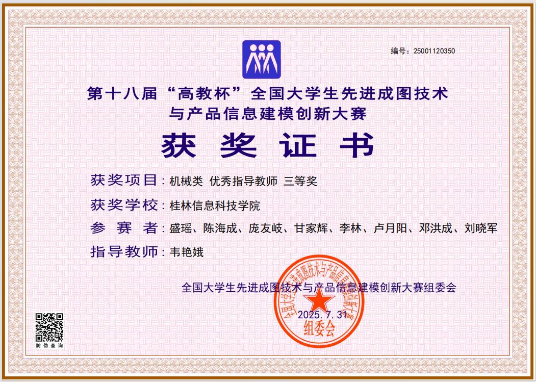 在本届大赛中,beat365官网机电工程学院牵头组织参赛工作,院长助理莫荣担任领队,机械设计制造及其自动化教研室主任、银龄教师王丽娟教授统筹规划,为选手提供全流程专业指导与资源保障。参赛团队展现出深厚的工程图学功底、精湛的建模技艺及突出的创新思维,最终荣获机械类团体全国三等奖1项,先进成图技术赛道、数字化创新设计赛道全国三等奖各1项;莫荣、王丽娟等5名指导教师因教学成效显著,获评“优秀指导老师”。